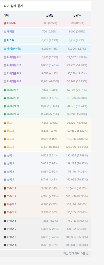 2. 게임 내 티어는 다음과 같이 분류되며, 랭크 1000명 이내는 in 1000이란 명칭으로 추가로 구분한다.