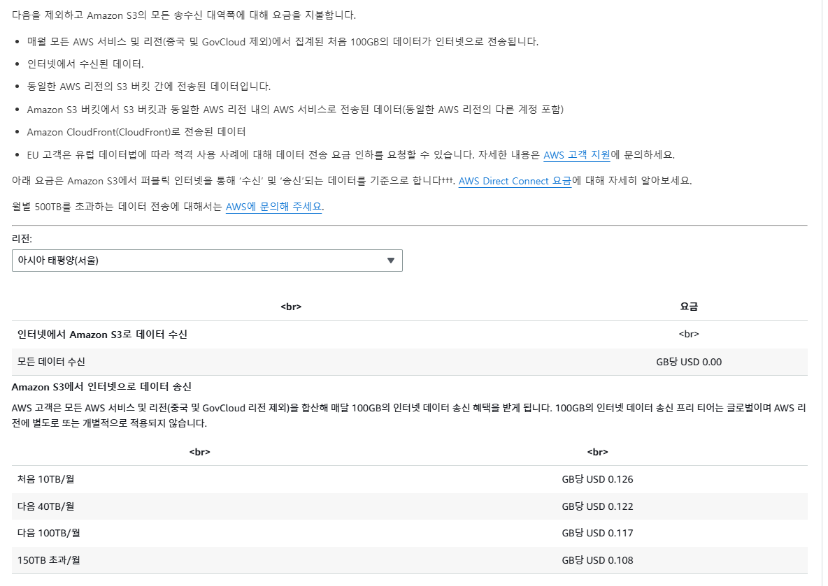 이외에도 Bronze 영역과 Silver 영역에 대해서 데이터 GET/POST 요청이 좀 많이 발생할 텐데, 그렇지만 동일 리전 내에서 발생하는 수신 데이터는 제외한다. 기본적으로 버킷과 서버는 API 요청과 웹 서비스 속도를 고려하여 서울 리전으로 설정할 생각에 있기에, 인스턴스와 버킷 간의 데이터는 비용이 없을 것으로 보고 있다. 만에 하나 발생해서 데이터 전송 비용이 발생할 경우, 로컬에 홈서버라도 구축해서 데이터 저장용으로 온프레미스하게 짜야할지도 모르겠다.