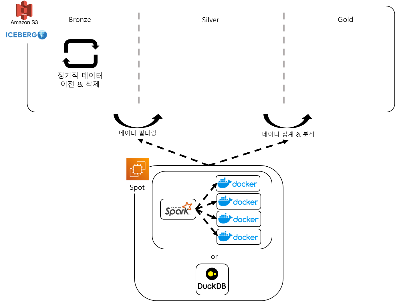 물론 데이터 엔지니어링 자체가 용량이 큰 데이터를 자주 수집하기에 이를 다루는 방법에 대해 많이 고안되어 있었다. 그래서 그중에서 수집/저장과 데이터 활용을 같이 활용하기 좋은 방법을 찾았고, 메달리온 아키텍처를 채택하기로 했다. S3에 버킷 하나를 두고 Prefix를 통해 구분할 수 있다는 점과 데이터 관리에 사용할까 고민 중이던 Iceberg에서 지원하는 점이 있다는 것이 좋았다.